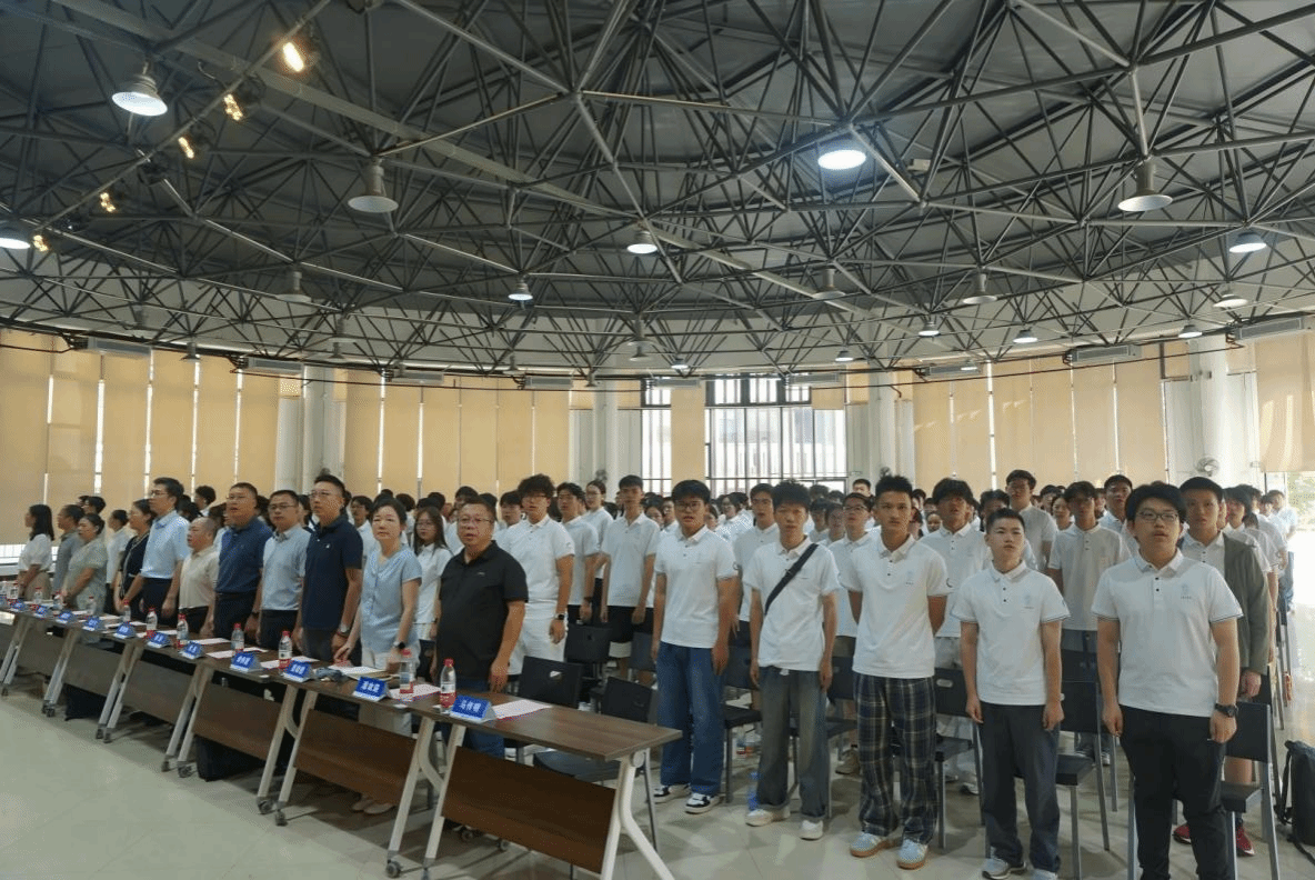 学院党委书记姜明敏为新生代表佩戴院徽。最后,与会师生齐唱《歌唱祖国》。