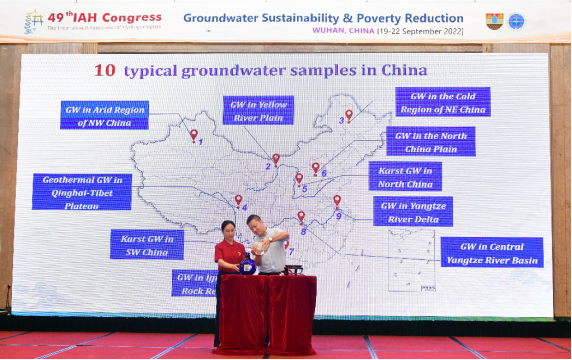 在9月22日举行的大会闭幕式上,大会组委会主席王焰新院士总结了本次会议的丰硕成果,并主持了“地下水奥运火炬传递仪式”,该仪式旨在激励和推动地下水科学的国际合作,提升公众对地下水的重视。本次大会组委会收集了中国10个不同代表性地区的地下水样,由我校水文地质学专业博士研究生代表在闭幕式现场混合,并汇入上两届主办国(巴西和比利时)的地下水瓶中,该水瓶将继续传递至第50届国际水文地质大会主办国南非。