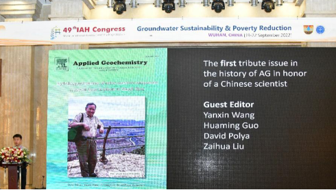 在播放下两届IAH大会主办国南非和瑞士的宣传视频后,Applied Geochemistry期刊执行主编王梓萌教授介绍了中国水文地球化学研究先驱沈照理先生纪念专刊的情况,专刊客座主编王焰新院士向部分论文作者颁发了Applied Geochemistry纪念专刊。